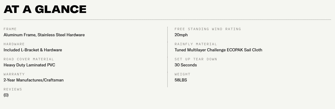 The Arc 180 Awning stands as a formidable, meticulously crafted fortress against the elements. Every aspect of this awning sets an industry standard, from the premium multi-layer fabric to the sturdy hubs and precision-machined joints. It's not a matter of merely meeting the standards; this awning is in the business of setting them. For those truly dedicated to their gear and unwavering in their commitment to quality, there simply isn't another awning on the market that can hold a torch to it. It's a testament to unwavering dedication to both gear and quality that sets the Arc 180 Awning apart from the rest.
