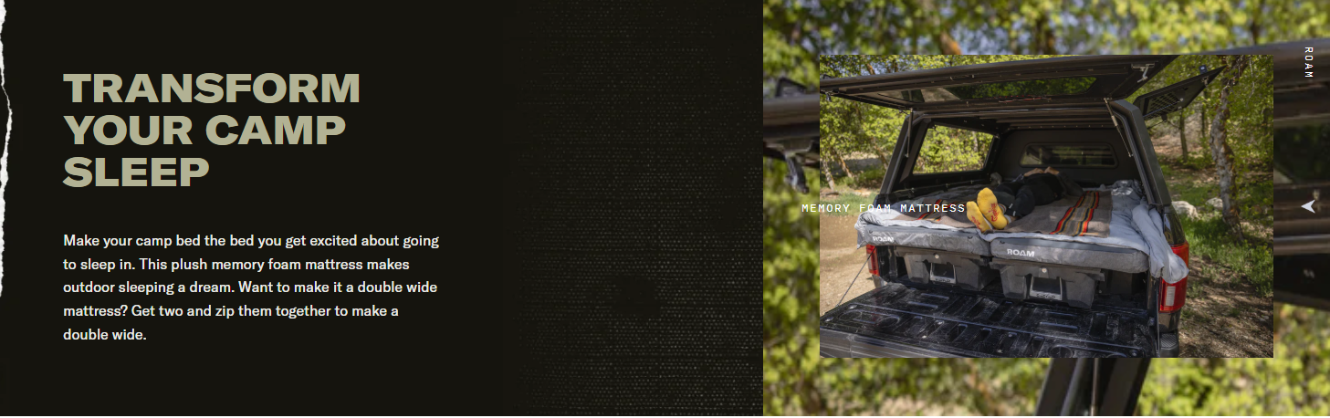 The Roam Memory Foam Mattress is a 4" dual-layer foam mattress that turns camping sleep into a dream. The top layer of the mattress is an ultra-plush foam designed for comfort while the base layer is a dense foam designed for structure and support. The dual-layer foam creates the ultimate sleeping experience and transforms your camp bed system. One of the innovative features of the mattress is its ability to daisy chain together with other mattresses giving it the ability to be a single, double, triple, or even a quad-width mattress. The base fabric is weather-resistant mélange and designed to be able to be laid on just about any surface. The top is a plush stretch nylon fabric that is comfortable, tough, and cool to the touch. When you are ready to stow your mattress there are integrated compression straps to minimize the stowed size of the mattress with a carrying handle built in.