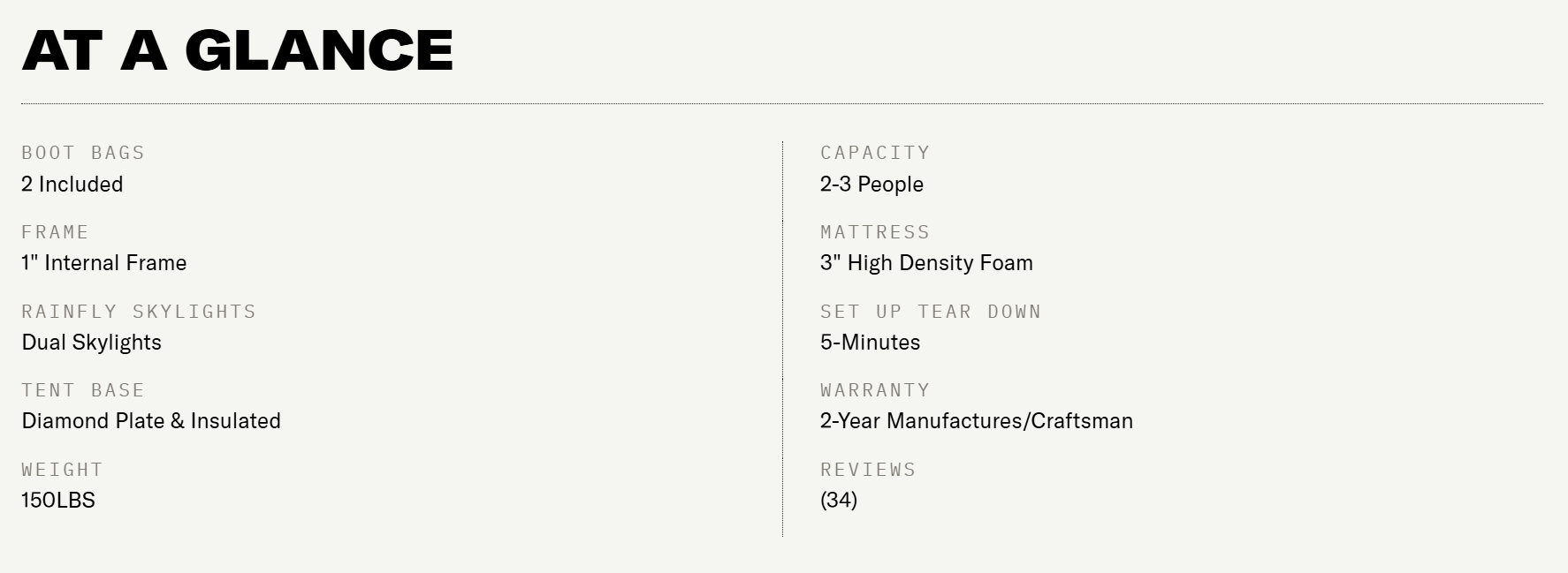 Having a stout internal frame insures the stoutness of the tent as well as making sure the tent fabric stays tight and reduces wind noise.