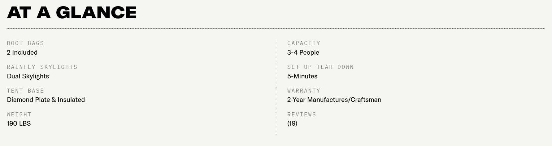 Having a stout internal frame insures the stoutness of the tent as well as making sure the tent fabric stays tight and reduces wind noise.